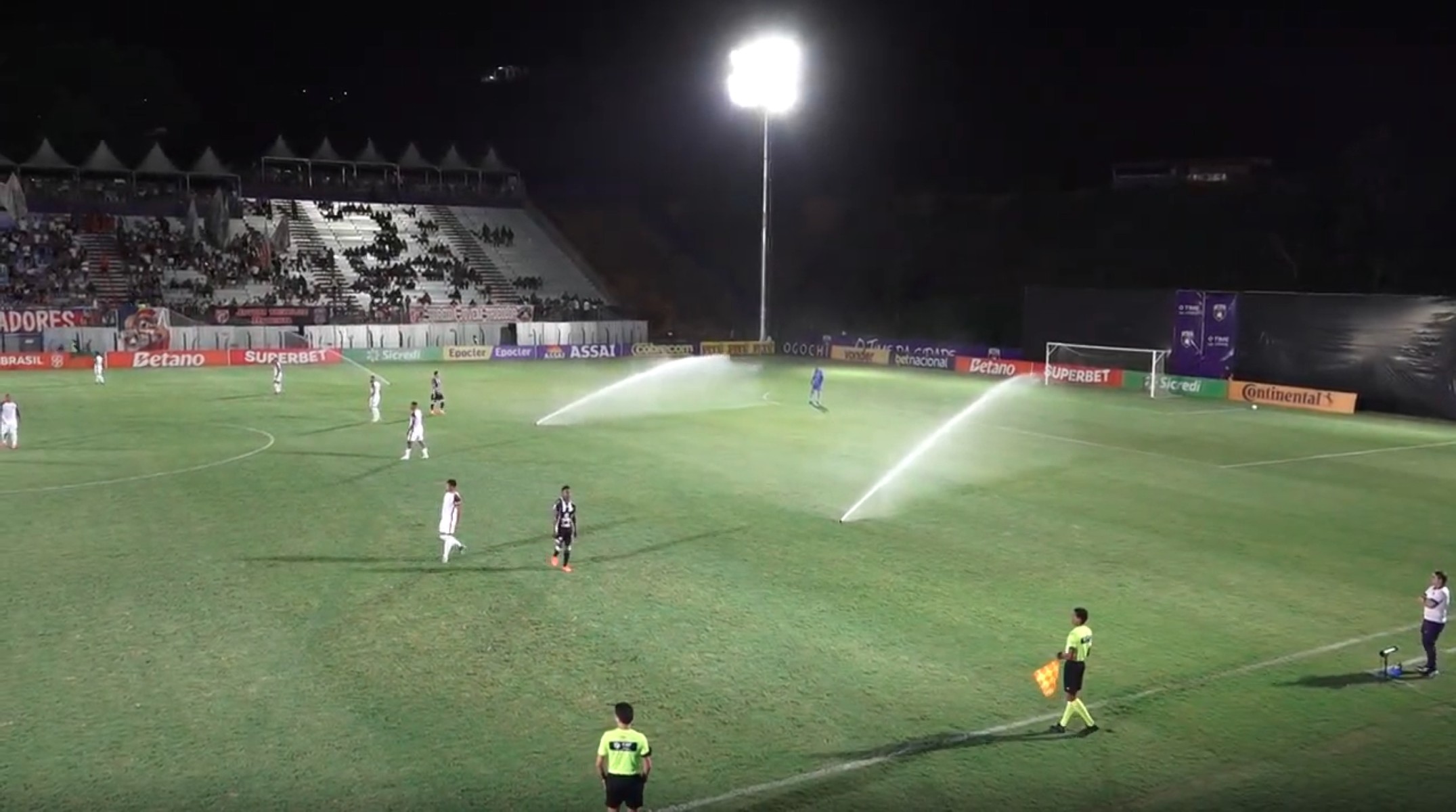 Olha essa cena! O jogo entre Betim e Operário-PR pela Copa do Brasil teve um convidado inesperado: o sistema de irrigação. Aos 5 minutos do primeiro tempo, os jatos de água invadiram o campo, forçando a paralisação da partida.